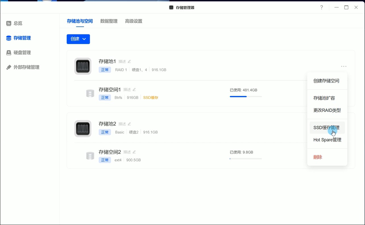 每个存储池仅能有一个 SSD 缓存,并且只能分配给该存储池下的存储空间使用。
