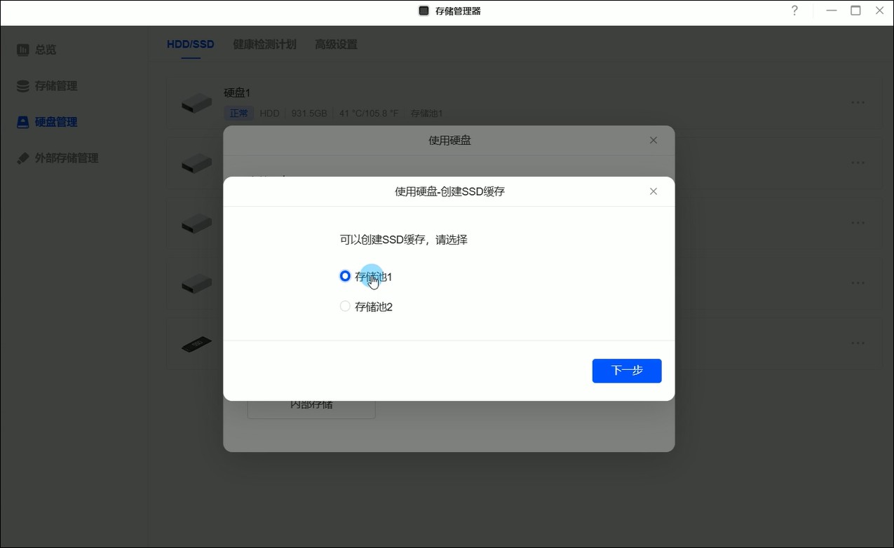 选择可以创建SSD缓存的存储池,然后点击“下一步”。