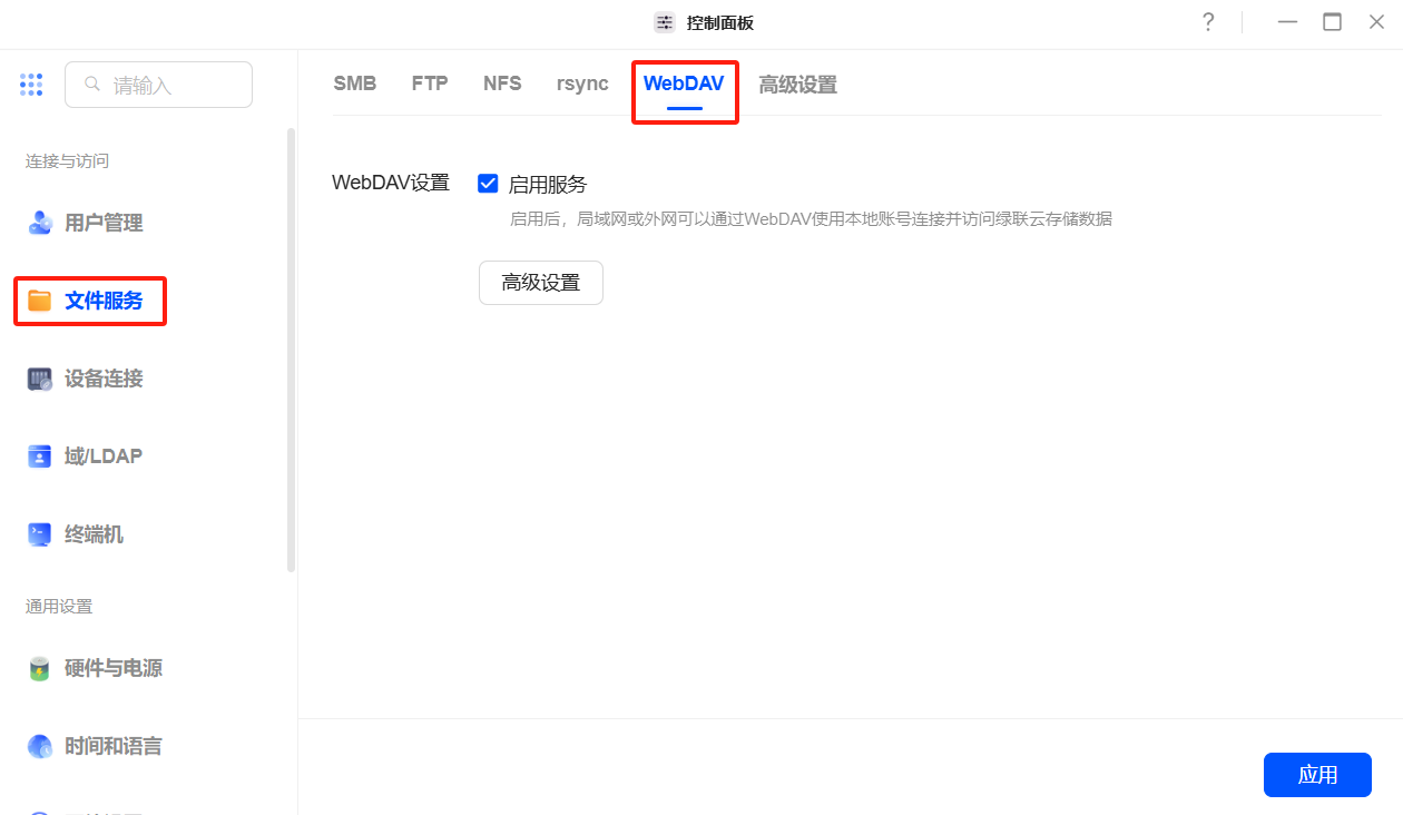 勾选“启用 WebDAV 服务”选项。