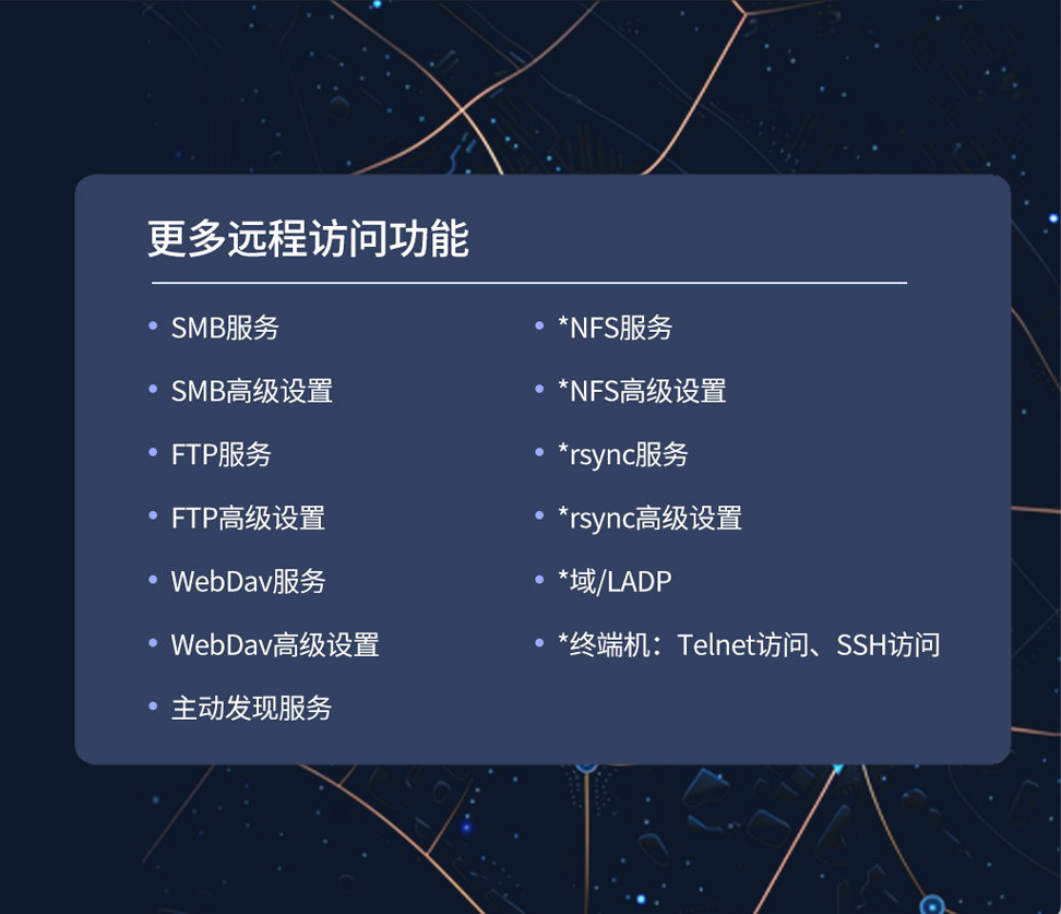 一个APP实现全部功能,简单易用,内置自动备份、影视中心、智能相册、Samba3.0多通道等多个好用实用功能,兼容手机/平板/电脑/智能电视/浏览器网页等平台访问,高效快捷,同时配有完善的向导式操作指引与在线技术支持